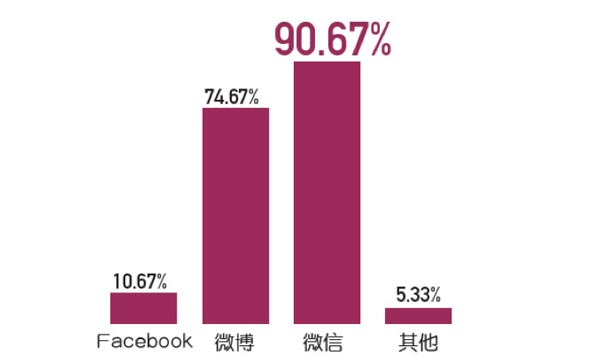 52.78%的中国企业已经应用“社交媒体”(如Facebook、微博、微信)进行业务或任务推动。对于“社交媒体”类别的选择,微信以90.67%的优势远高于其他此类应用。