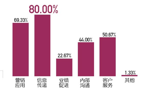中国企业应用“社交媒体” 主要推动信息传递、营销应用、客户服务等方面的任务。信息传递仍为首选,但好在营销应用、客户服务等方面的进程正在加快,尽管在此方面可能还没有明确的ROI计算方式和标准化的KPI指标。